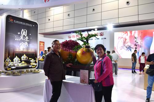 9月19日,第八届山东国际文化产业博览交易会在山东国际会展中心开幕。展会当日,丰富多彩的博山琉璃精品展示和项目推介等活动,吸引了大批国内外参观者驻足,博山文化发展改革成就和博山文化元素在全省平台上大放异彩。 据悉,此次文博会以“壮丽七十年 盛世文博汇”为主题,共设置综合展区、“文化+”展区、新动能新业态新媒体展区、“一带一路”展区、创意设计展区、工艺美术精品展区、家文化展区、文化传承展区、书画精品展区9大展区和1个供需洽谈区。在淄博展区现场,博山琉璃企业西冶工坊、爱美琉璃、康乾琉璃、金祥琉璃、鲁玉陶瓷等重点企业的琉璃精品在展会上展出。西冶工坊负责人刘建华说:“西冶工坊展品位于D展区的中心位置、山东省重点文化出口展示区。这里人流量很大,在我们展区最吸引参观者的就是国宴天鹅,看到博山琉璃艺术展品越来越受欢迎,既高兴又自豪。” 展区现场,人流涌动,不少参观者驻足凝望。“这么大的石榴啊!老伴,快过来看啊,这是我见过最大的石榴了!”来自青岛的辛杰拉着老伴就要在石榴面前自拍,看着老人们不太熟悉的姿势,爱美琉璃公司的负责人热情地上前帮助两位老人拍照留念,并向老人介绍道:“这是在2019中国博山琉璃文化艺术节上发布的世界最大的手工烧制琉璃石榴,由淄博爱美琉璃制造有限公司运用博山琉璃传统工艺制作的琉璃文化艺术节标志作品。这颗石榴直径达70厘米,象征新中国成立70周年,内里镶嵌56颗琉璃石榴籽,寓意56个民族团结和谐、繁荣发展。”听完介绍后,两位老人都对博山琉璃艺术赞叹不已。
