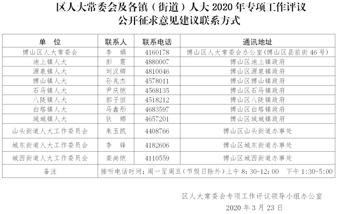 市人大常委会2020年票决确定对市公安局、市人力资源社会保障局、市自然资源局、市住房城乡建设局、市交通运输局、市城市管理局6个政府部门开展专项工作评议。 疫情防控期间,全市各级人大代表、广大人民群众和各级各部门全力强化疫情防控,为打赢疫情防控人民战争、总体战、阻击战作出了重要贡献。目前,疫情防控形势发生积极向好变化,取得了阶段性重要成果。在做好疫情防控工作的同时,为支持和督促被评议部门改进工作、转变作风、提升效能,市人大常委会专项工作评议领导小组决定进一步征求各级人大代表和广大人民群众对被评议部门的意见建议,将意见建议征集时间节点延长至4月20日。希望全市各级人大代表和广大人民群众继续对上述6个被评议部门提出意见建议。 今年的专项工作评议,仍然坚持市、区县、镇(街道)“三级联动”。现将区人大常委会及各镇、街道人大公开征集意见建议电话、联系人及通信地址公告如下(各镇街的通信方式及联系人由各镇街负责公告): | |||
