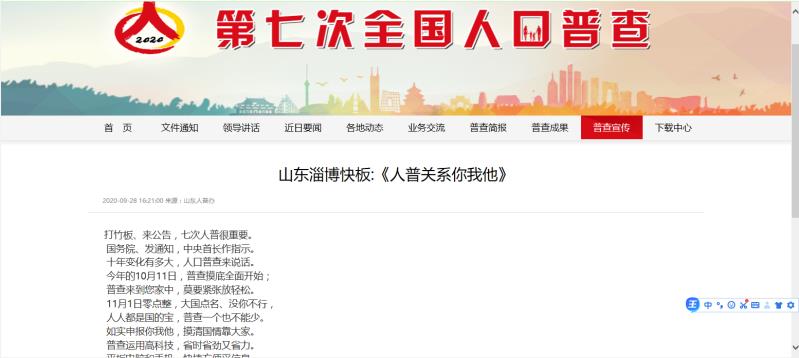 “打竹板、来公告,七次人普很重要。国务院、发通知,中央首长作指示。十年变化有多大,人口普查来说话……。”9月28日,博山快板作品《人普关系你我他》成功入选国家统计局人口普查网站。 该作品以博山区第七次全国人口普查为素材,将人口普查的重大意义、需要填报的普查指标及普查相关流程等内容,通过群众喜闻乐见的快板形式表达出来,语言通俗易懂,风格活泼明快,收到了良好的宣传效果,使人民群众能够快速理解、支持人口普查,进一步确保了人口普查工作更加深入人心,烘托出了人口普查的浓厚宣传氛围,为人口普查的入户摸底和数据登记工作顺利开展提供了坚实的舆论保障。