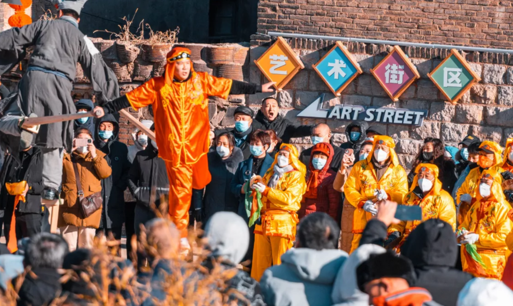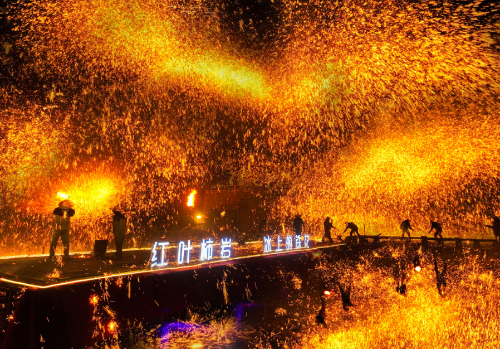 红叶柿岩旅游区 红叶柿岩旅游区用一场冰上的铁花揭开元宵节活动序幕。漫水桥上,1600℃铁水被撒向天空,被匠人猛力击打后形成几层楼高的铁花雨,在夜空中绚烂绽放,冰面舞台,火花盛宴,跨越千年的非遗技艺盛大绽放在红叶柿岩夜空,形成了一幅幅大气、震撼、壮美的画面。元宵节当天,景区还在国潮红叶柿岩支起3米超级大锅煮汤圆,开启万人团圆盛宴。