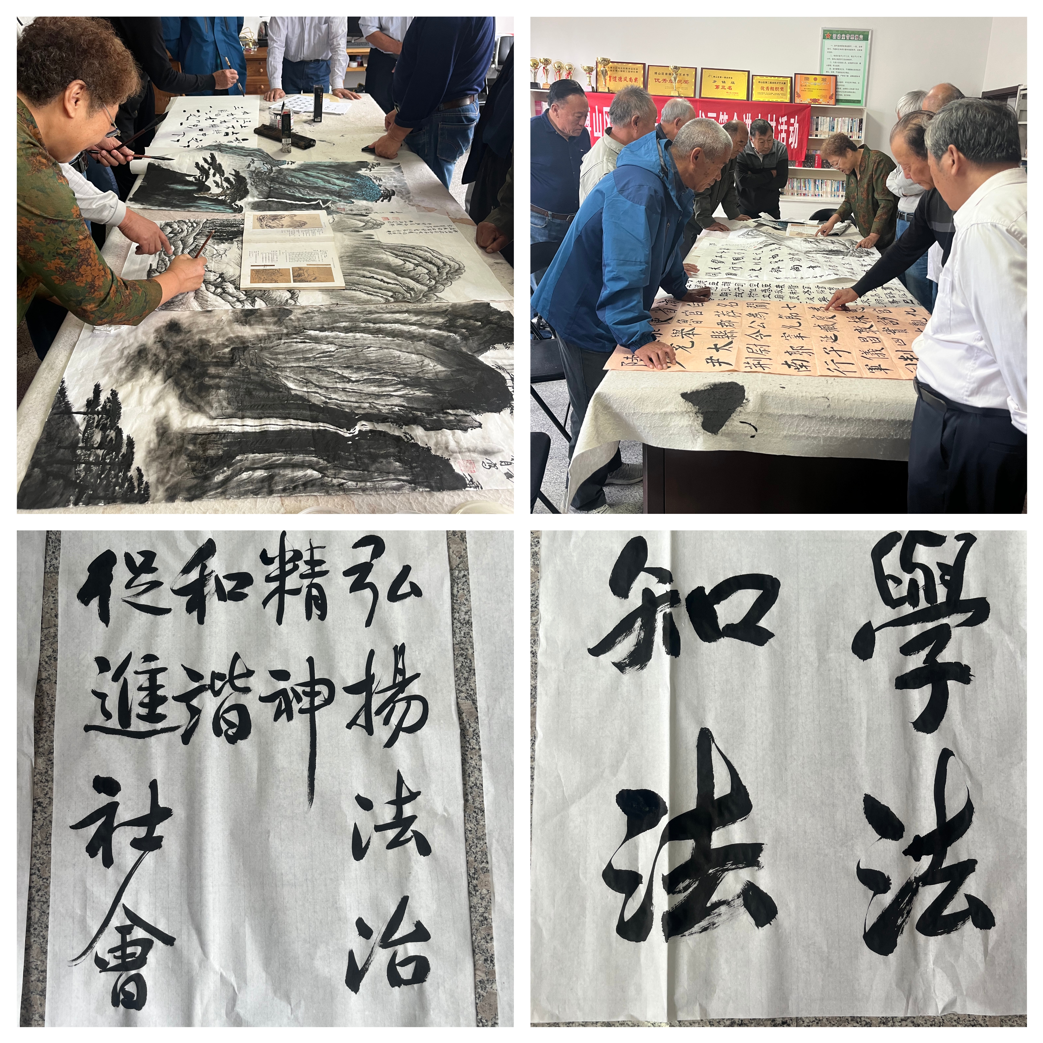 为深入推进法治文化在基层的传播,鼓励更多文艺工作者创作优秀的法治文艺作品,满足群众法治文化需求,在国庆、中秋来临之际,博山司法所联合镇文旅办开展“我们的节日·法治书画笔会”活动。 活动现场,书法爱好者们摆开桌案,铺陈宣纸,挥毫泼墨,现场创作书法绘画作品,在一笔一划间展现文化艺术的博大精深,感悟法治精神的深刻内涵。“依法治国”“知法学法”“法通民意九州春暖 德润人心四海升平”……创作书画作品共计30余幅,既有关于法治文化的古今经典、诗词联赋,也有引导大家树立正气、反腐倡廉的警示画作,一幅幅大气磅礴或者温婉细腻的书法作品和画作,在为基层群众送去精美画作的同时,也送去了法治思想,传播了法治精神。 此次普法宣传活动把我国传统的书法艺术与法治宣传教育结合起来,以笔墨书写法治信仰、用书画传达法治思想,充分发挥出传统文化在法治宣传教育中的积极作用,为推进全镇法治文化建设营造了浓厚的法治氛围。