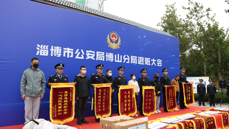 点击播放视频 10月30日,博山公安分局2025年度退赃大会暨打击成果展举行。区委副书记、政法委书记刘青出席活动。 2025年以来,全区公安机关坚持“以人民为中心”的发展思想,始终将打击犯罪、守护平安作为首要政治任务,坚持“零容忍”导向,保持严打高压态势,全力维护社会治安大局稳定。全区110接报刑事、治安警情分别同比下降37.5%和17.6%;持续深化扫黑除恶专项斗争,对“盗抢骗”等多发性侵财犯罪实施快侦快破;强力推进电信网络诈骗打击治理,不断强化警银协作,为群众挽回经济损失;重拳整治“环食药”领域犯罪,全力筑牢民生安全防线,让群众切身感受到平安触手可及、就在身边。 在退赃仪式上,部分居民在民警的引导下,依次领回了自己失而复得的财物,群众代表将一面面锦旗郑重地交到办案民警手中。活动现场,共退还群众被盗物品及现金价值60余万元,收到群众赠送锦旗10面。还展示了各类新型反恐处突装备,与现场群众进行了趣味互动,开展了反电信网络诈骗、网络安全、禁毒、户籍政策、文明养犬等业务知识宣传。 | |||