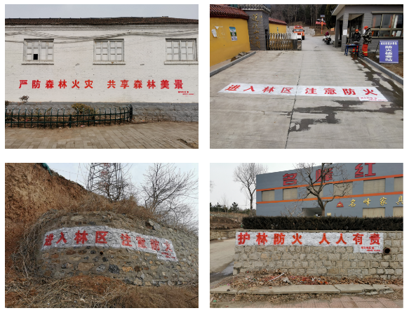 条形横幅保留时间短、稳固性差、易造成污染,而粉刷标语保存时间长、视觉效果强、提醒效果好,能最大限度提高当地居民和外来游客的安全意识,达到普及森防知识、传播平安理念的效果。城东街道结合实际情况,采用喷涂固定标语的方式进行宣传。在前期全面排查梳理形成台账的基础上,护林防火队员分组行动,在做好巡逻检查的同时,携带工具,在村、景区醒目位置粉刷标语,宣传防火知识,提升安全意识,形成浓厚的宣传氛围。截至目前,第一批30余幅防火标语已全部喷涂完毕。