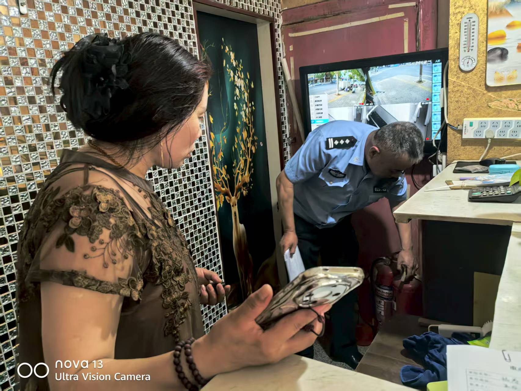 7月8日,城东街道党工委委员李硕带队联合派出所、社区对五岭路重点场所进行消防安全检查;