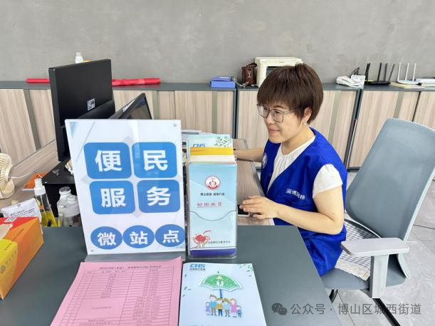 近日,在博山区文化馆西邻,城西街道便民服务微站点内,专职帮办代办员正在用手机为张女士办理灵活就业人员基本医疗保险缴费。