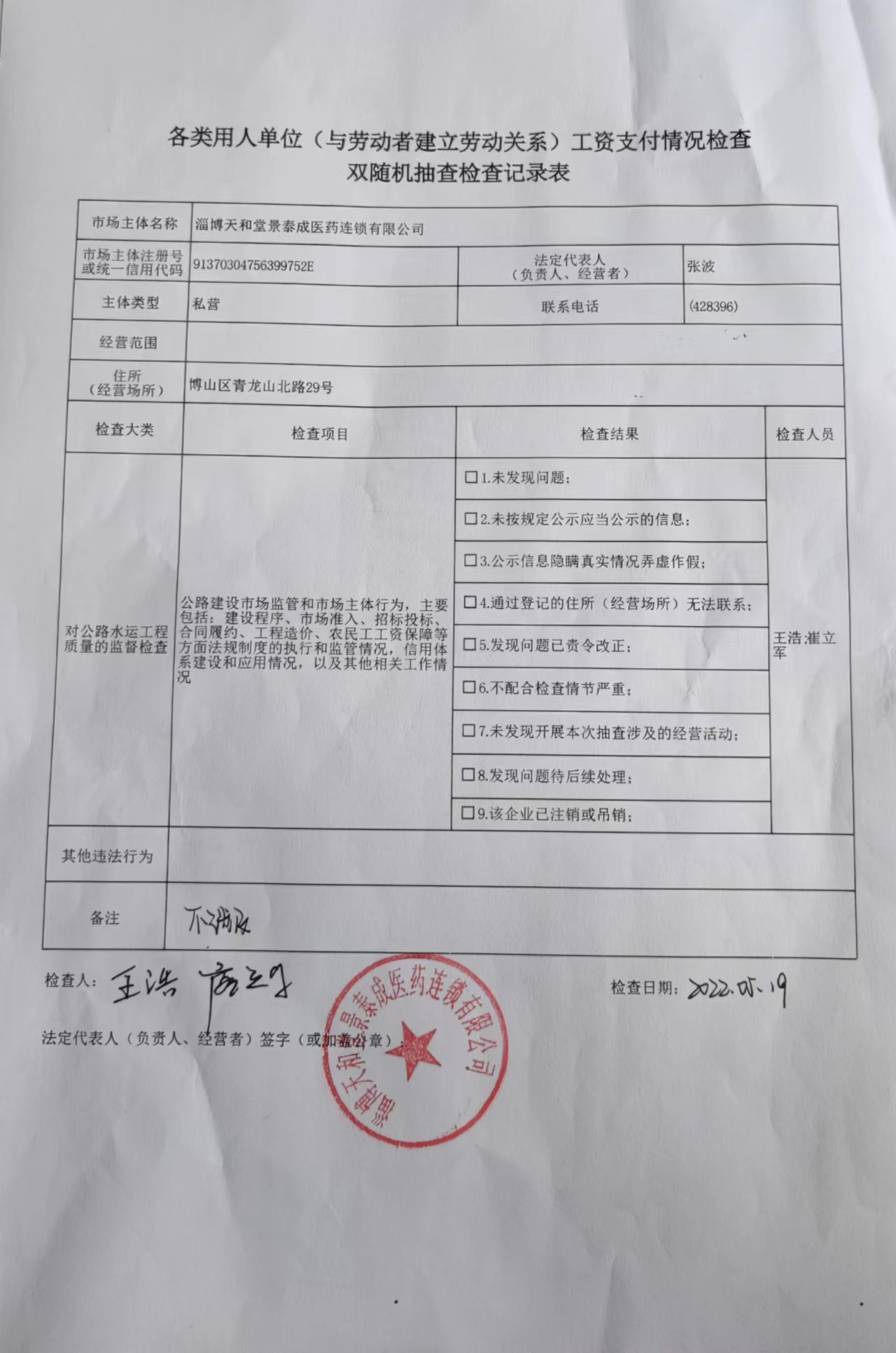 对淄博天和堂景泰成医药连锁有限公司双随机抽查检查记录表
