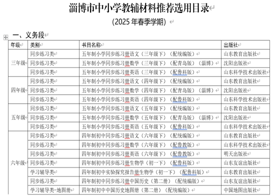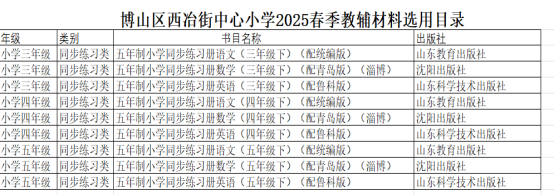 为进一步规范学校教辅材料征的征订、管理和使用工作,根据上级文件要求,现将《山东省中小学教辅材料评议目录》《淄博市中小学教辅材料推荐选用目录》及《博山区西冶街中心小学2025年春季学期教辅材料选用结果》予以公示。