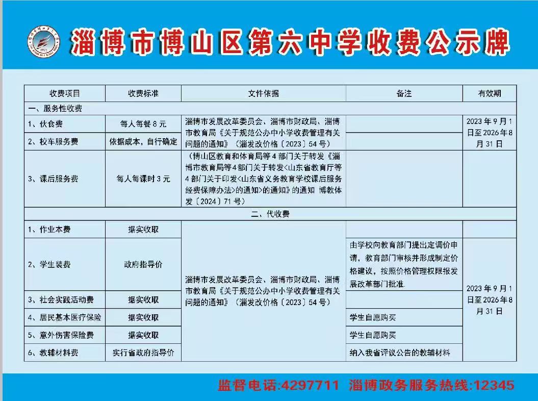 淄博市博山区第六中学收费公示牌
