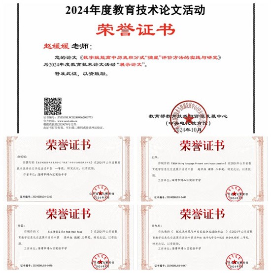 近日,淄博市博山区实验中学多名教师在2024年山东省教育信息化活动中获佳绩。赵媛媛老师的论文《数字赋能历史积分式“摘星”评价方法的实践与研究》获全国2024年度教育技术论文活动“展示论文”,谢旭东老师的课例《探究汽车尾气中有害成分及消除方法》获山东省融合优质课二等奖,王萍老师的课件《B3U4 Using language:Present continuous passive》获山东省二等奖,谢蕾老师的微课《英文诗歌鉴赏A Red Red Rose》获山东省三等奖。