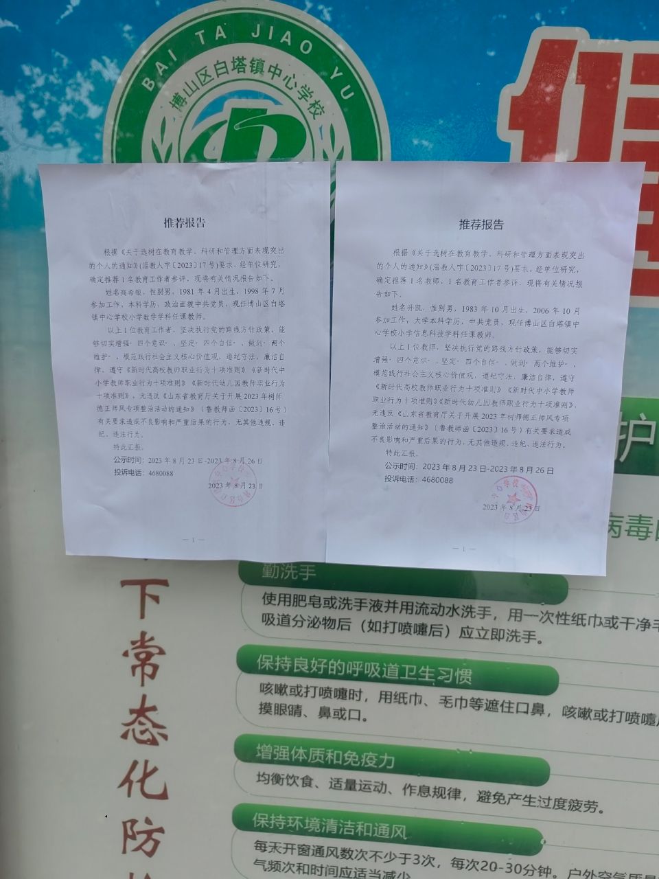 博山区白塔镇中心学校教师评先树优推荐报告公示