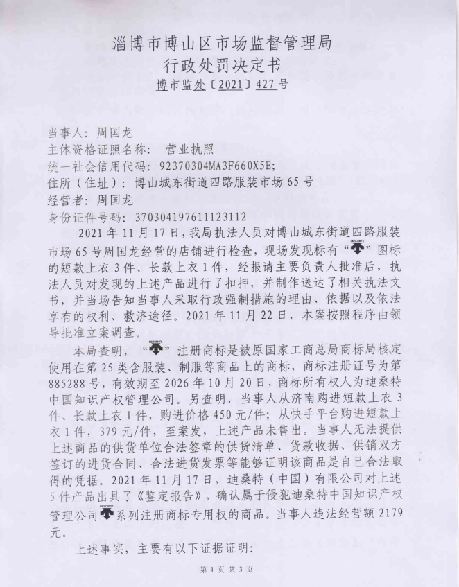 周国龙销售侵犯注册商标专用权的商品案处罚信息公示