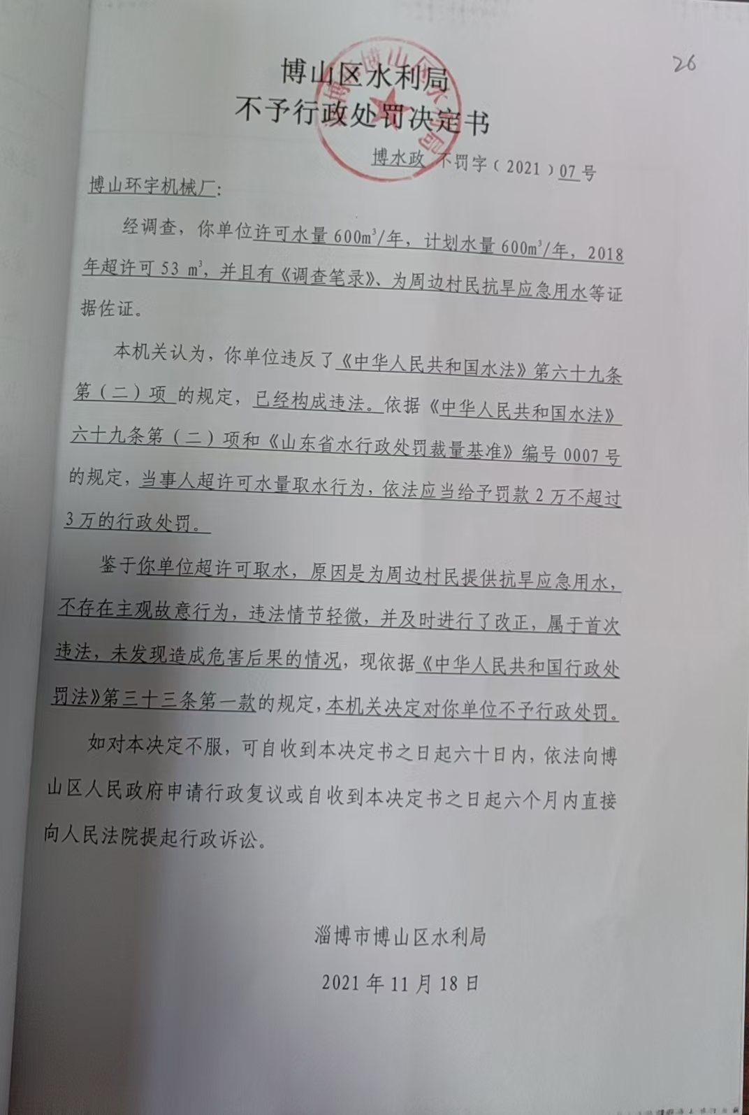 博山区水利局不予水行政处罚决定书(博山环宇机械)