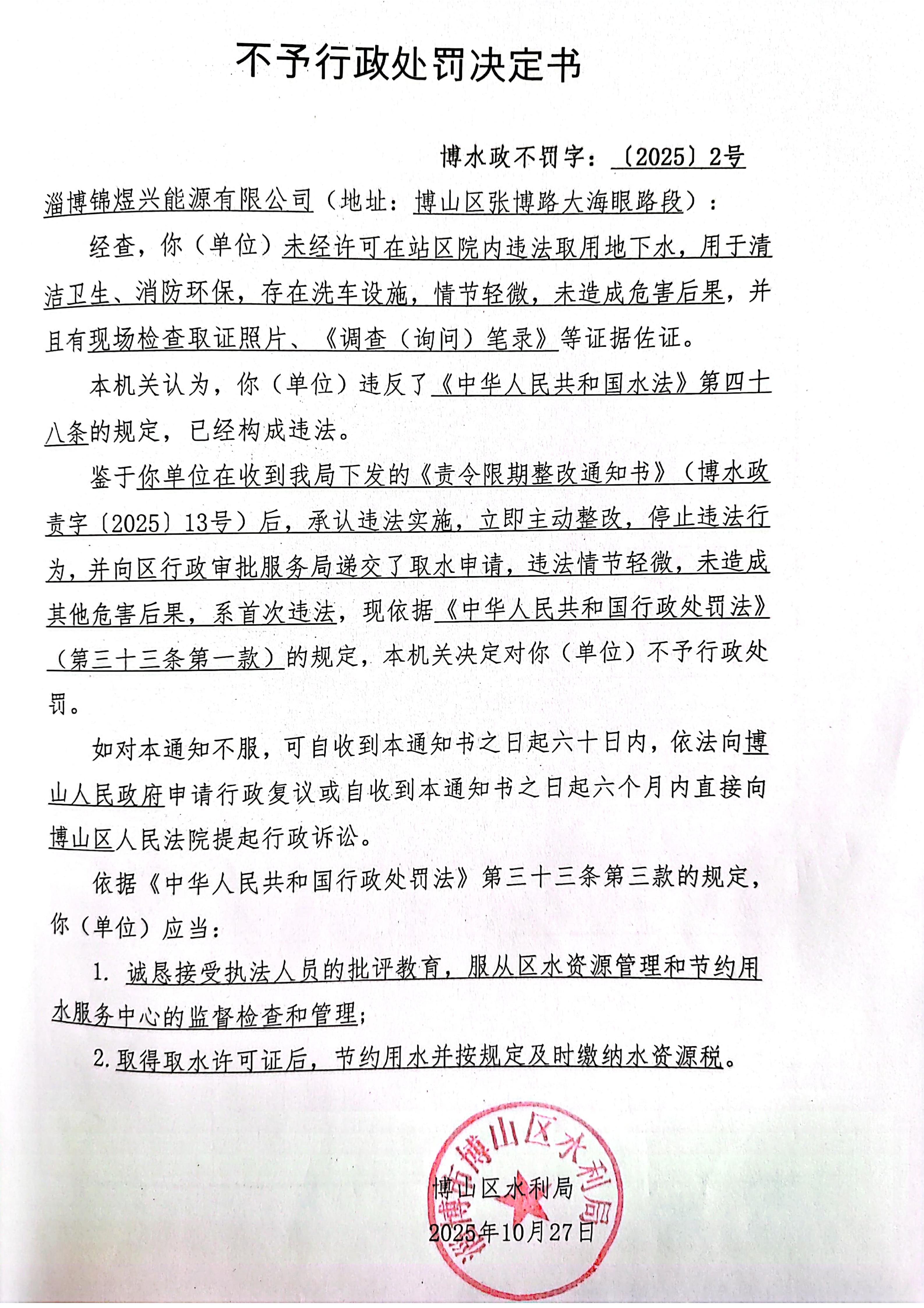 不予行政惩罚决定书(淄博锦煜兴能源有限公司)