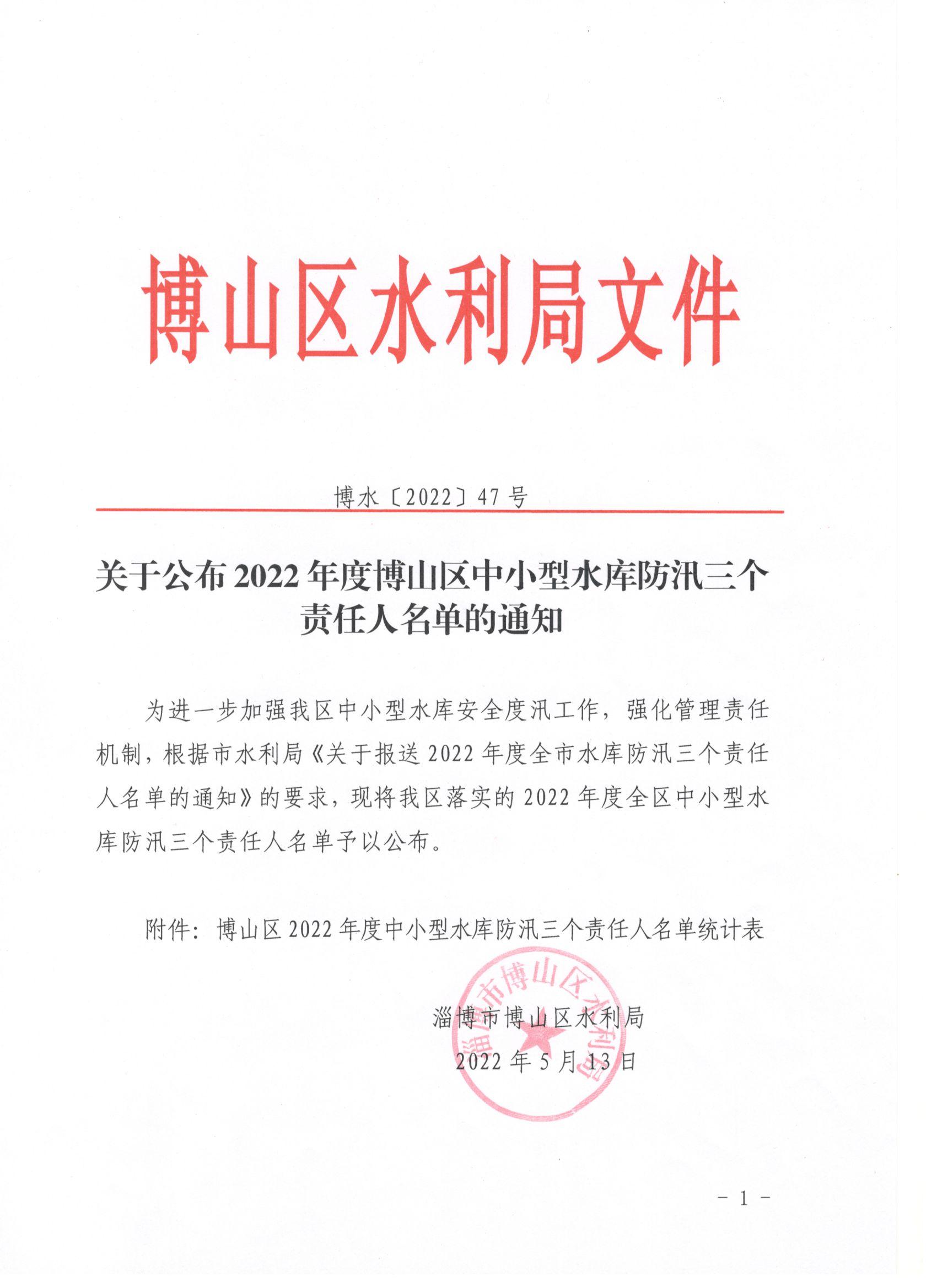 关于公布2022年度博山区中小型水库防汛三个责任人名单的通知