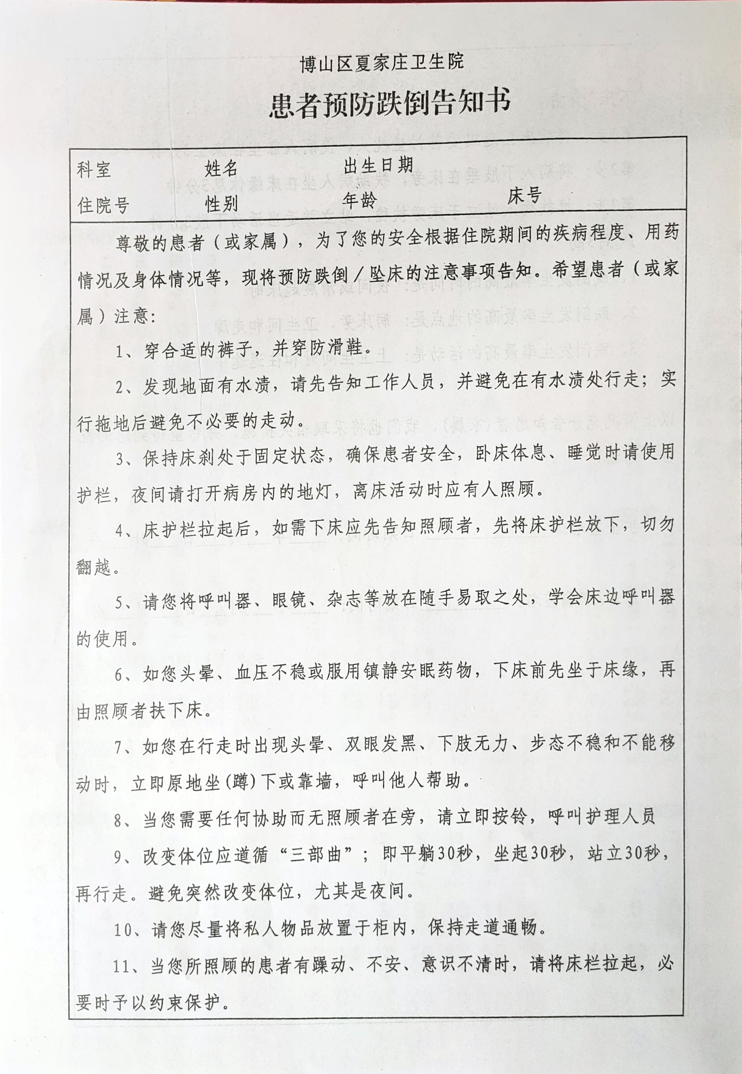 博山区夏家庄卫生院患者预防跌倒告知书
