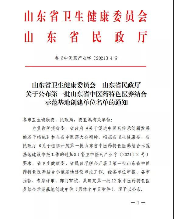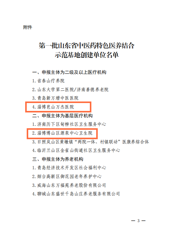 近日,山东省卫生健康委、山东省民政厅联合印发《关于公布第一批山东省中医药特色医养结合示范基地创建单位名单的通知》,淄博岜山万杰医院、博山区源泉中心卫生院榜上有名!