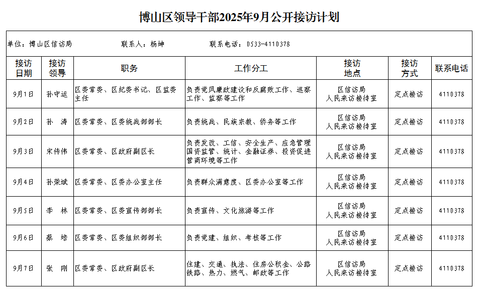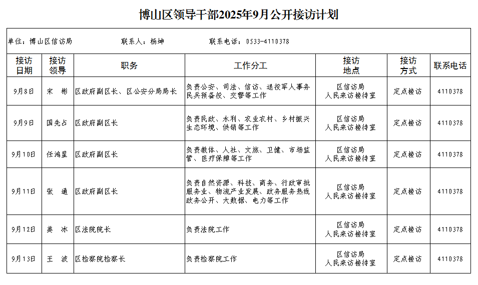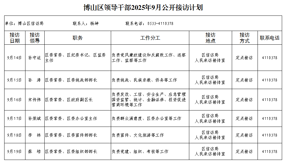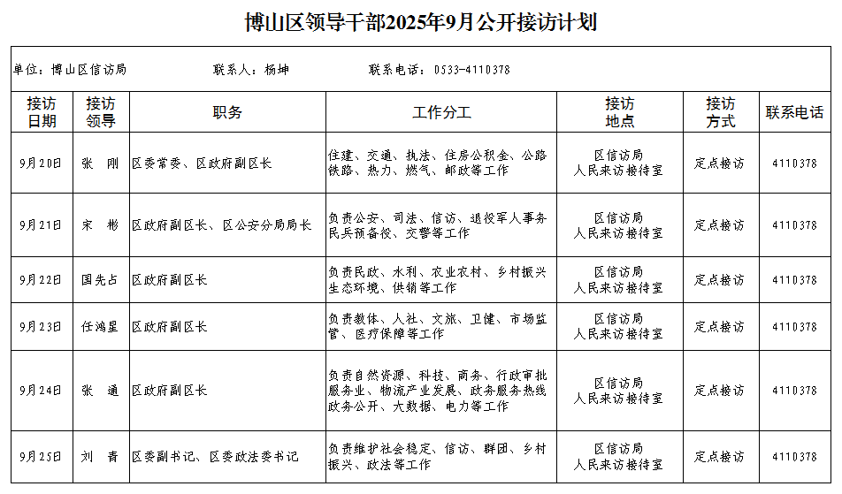 博山区领导干部2025年9月公开接访计划