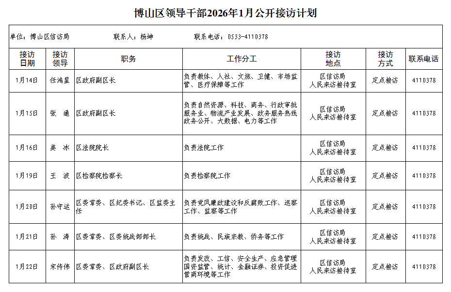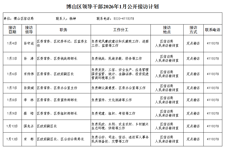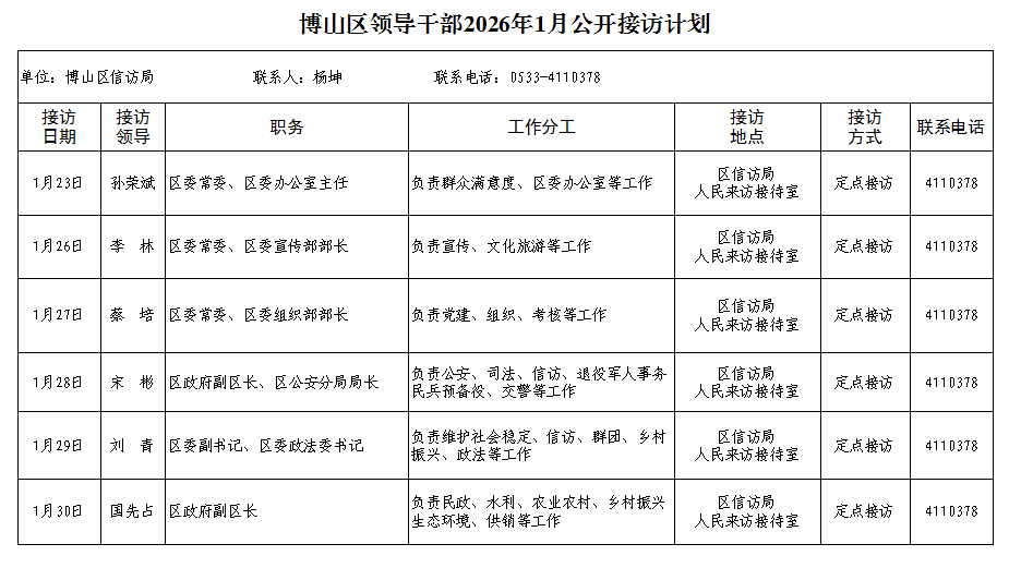 博山区领导干部2026年1月公开接访计划