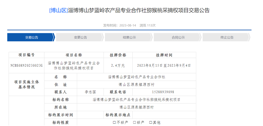全国首例“猕猴桃采摘权”在博山源泉产权交易服务站成功发布交易公告,本次源泉西村梦蓝岭猕猴桃采摘园项目采用公开招标的方式,挂牌价为2.4万元,预计猕猴桃产量在4000斤左右。目前在淄博市公共资源交易网首页左侧已开通专属交易通道。