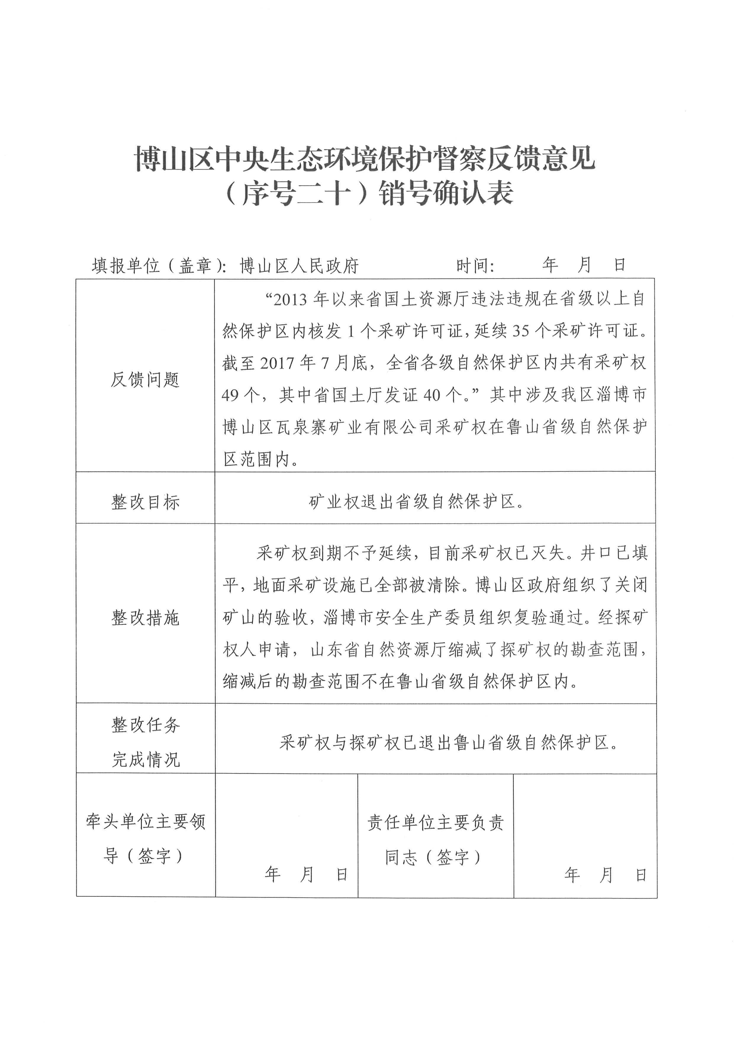 博山区中央生态环境保护督察反馈意见(序号二十)销号确认表