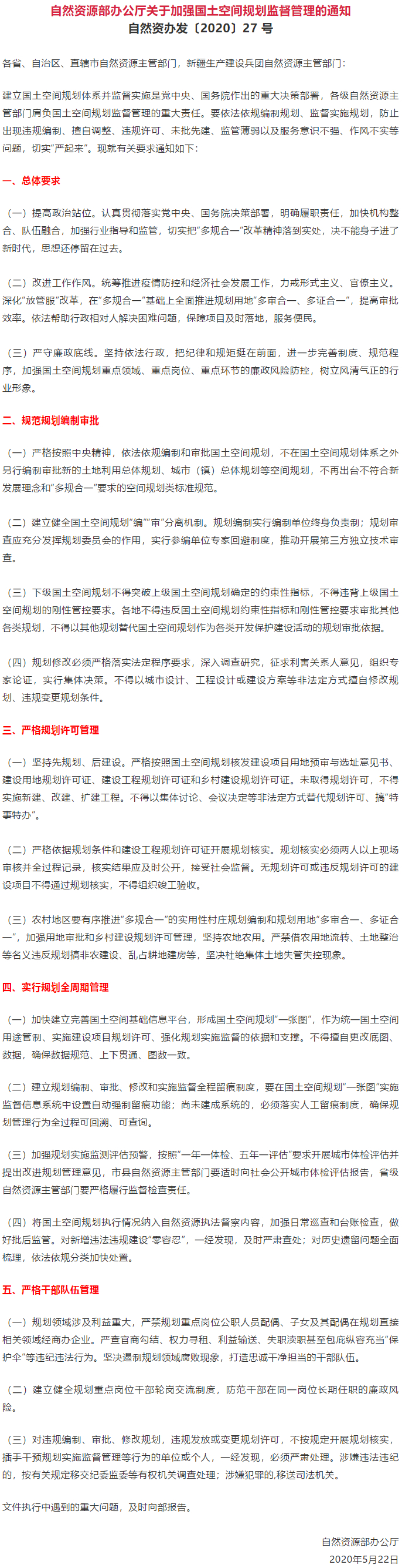《自然资源部办公厅关于加强国土空间规划监督管理的通知》(自然资办发【2020】27号):